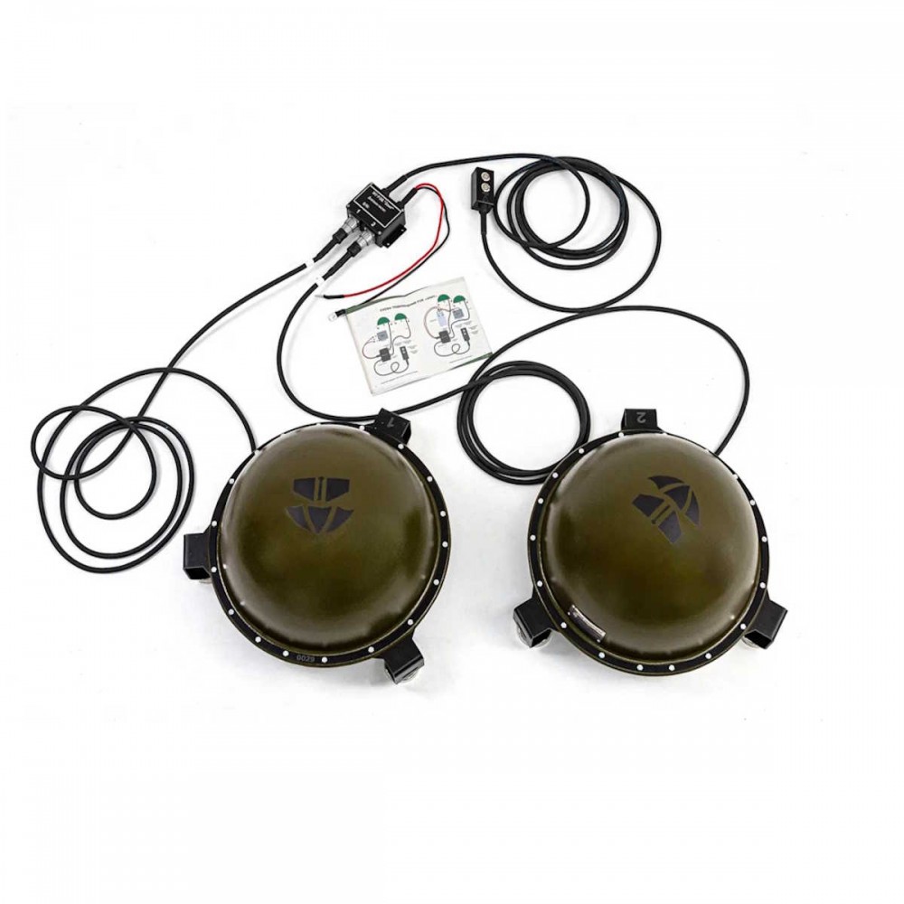 Модули монтируются на крышу или площадку техники с использованием магнитных опор, без доработки кузова. Питание подаётся от штатной бортовой сети 12/24 V, управление выносится в салон на удобную кнопку или пульт. Конструкция и корпуса разработаны с учётом работы в пыли, дожде и перепадах температур, поэтому комплекс подходит для регулярной эксплуатации в полевых выездах, на грунтовых дорогах и учебно-боевых выходах.